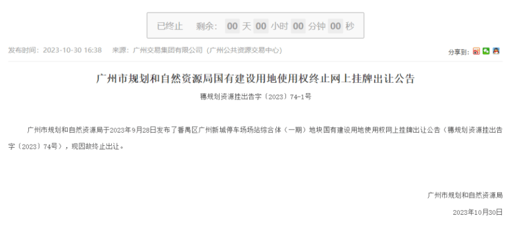 昨日,广州公共资源交易中心发布公告,原定于10月31日出让的番禺区广州新城停车场场站综合体(一期)地块因故终止出让。