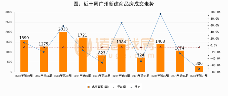 进入2024年第06周(02月05日-02月11日),广州新建商品房成交306套,较上周减少768套,环比下降71.5%