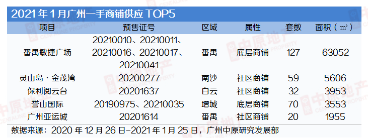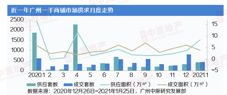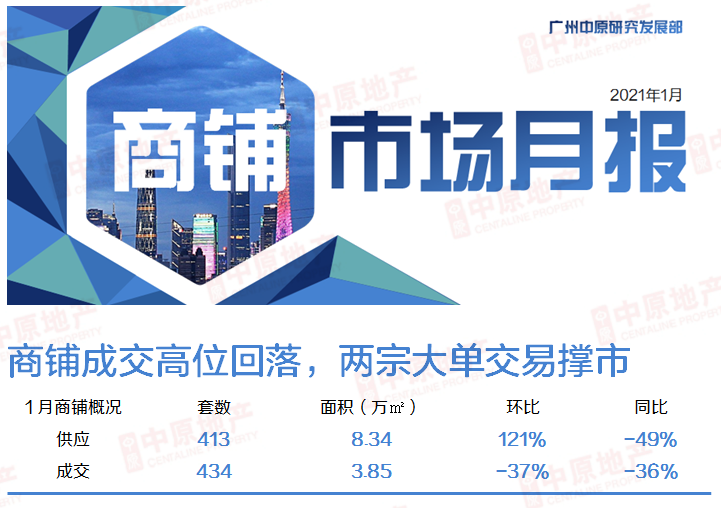 2021年首月,广州商铺市场因万博板块新盘大量新货入市,供应冲高至413套8.34万㎡,供应量环比上涨121%。