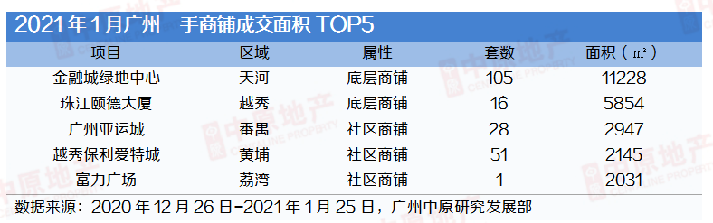 此外,荔湾区旧盘富力广场本月也录得一套2000多㎡的大面积商铺交易,来自项目S5-S6栋的二层。其余两个上榜项目为番禺区广州亚运城、黄埔区越秀保利爱特城,项目社区商铺持续销售,本月各成交0.29万㎡、0.21万㎡。