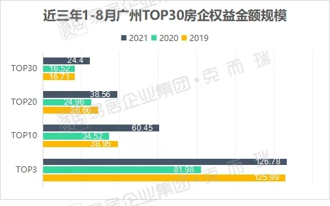 据克而瑞数据统计,2021年1-8月广州TOP30房企权益销售金额规模为1843.3亿元,同比上涨58.5%。