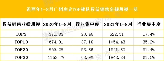 克而瑞监测到,在今年1-8月中广州TOP3房企权益销售规模的行业集中度为17.4%,同比去年下跌了3%,为各梯队中跌幅较大值;TOP10房企行业集中度为35.2%,同比下跌1.9%。