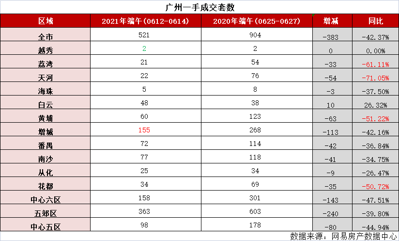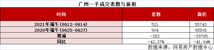 网易房产数据中心监控阳光家缘数据显示,2021年端午假期(0612-0614)广州一手楼网签成交521套,与2020年端午假期(0625-0627)的904套相比,减少383套,下降42.37%。