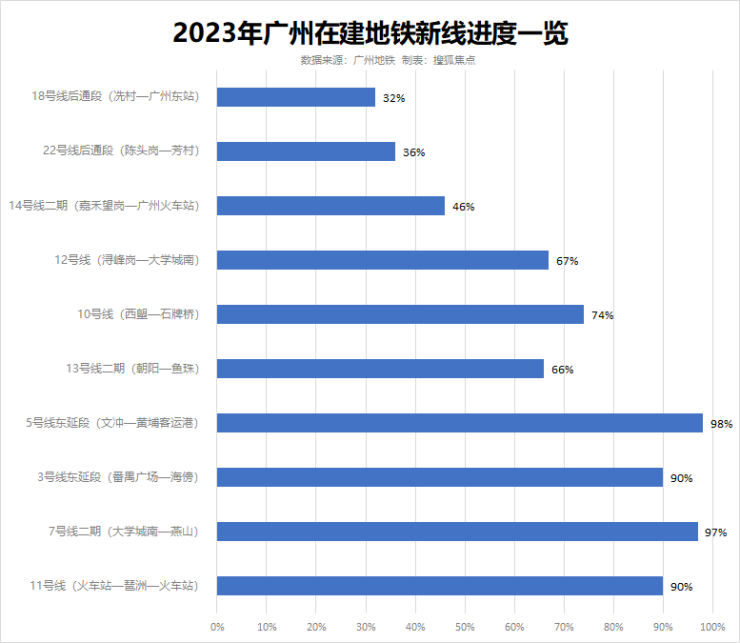 据广州地铁最新公布的数据,截止5月底,10条在建地铁线中,5号线东延段目前进度第一,土建工程累计完成98%;7号线二期紧随其后,土建工程累计完成97%。