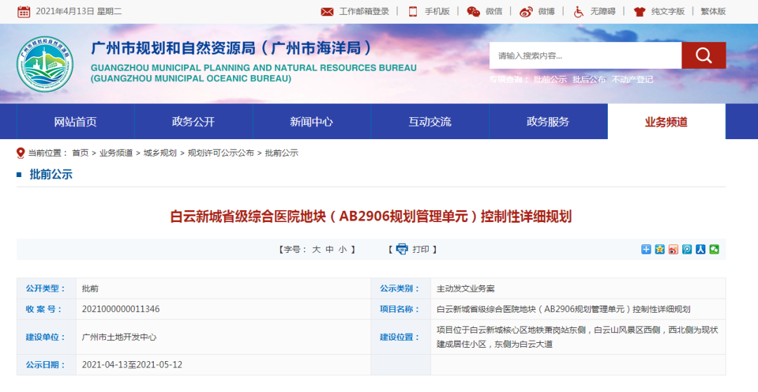 4月13日,广州市规划和自然资源局发布白云新城省级综合医院地块(AB2906规划管理单位)控规性详细规划公示,将原AB2906地块部分商业/商务用地或合并调整为医疗卫生用地,拟建设省级综合医院,根据医院使用需求,其周边市政道路也将调整和优化。