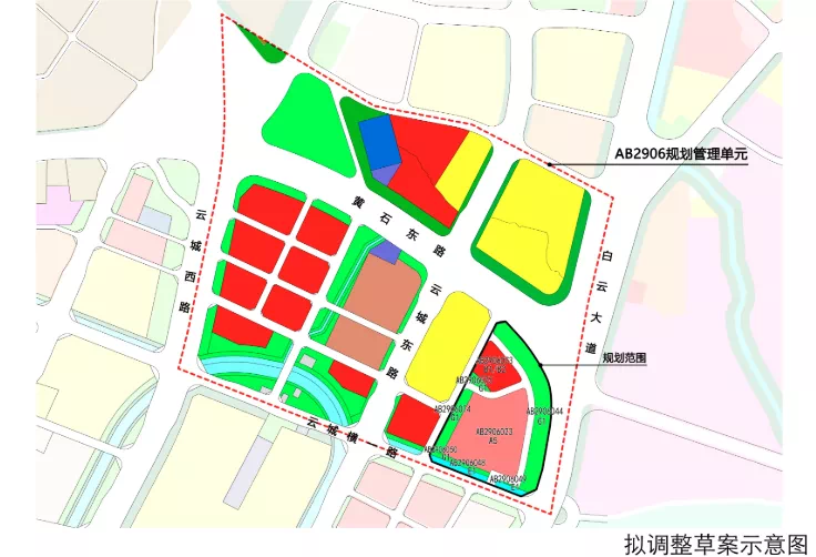 项目地块位于AB2906规划管理单元东南,白云大道以西、黄石东路以南,云城横一路以北,规划范围总用地面积65163.6平方米。