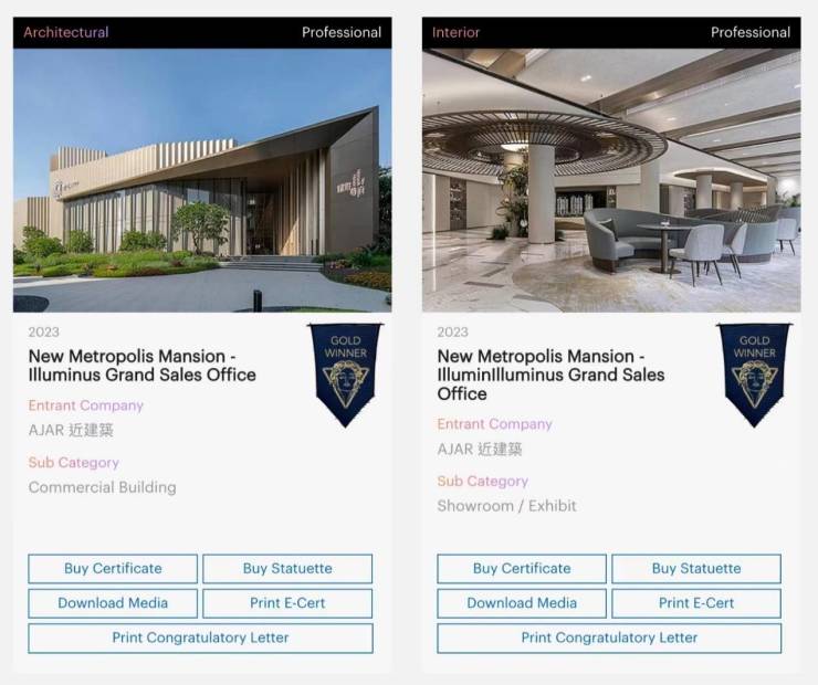 2023 MUSE Design Awards (缪斯设计奖)在今年3月也宣布了年度获奖名单。新世界耀胜尊府项目凭借其全球视野观、创设计概念斩获2023 MUSE 设计奖建筑设计类别—金奖,在国际奖项舞台上获得极大的肯定。