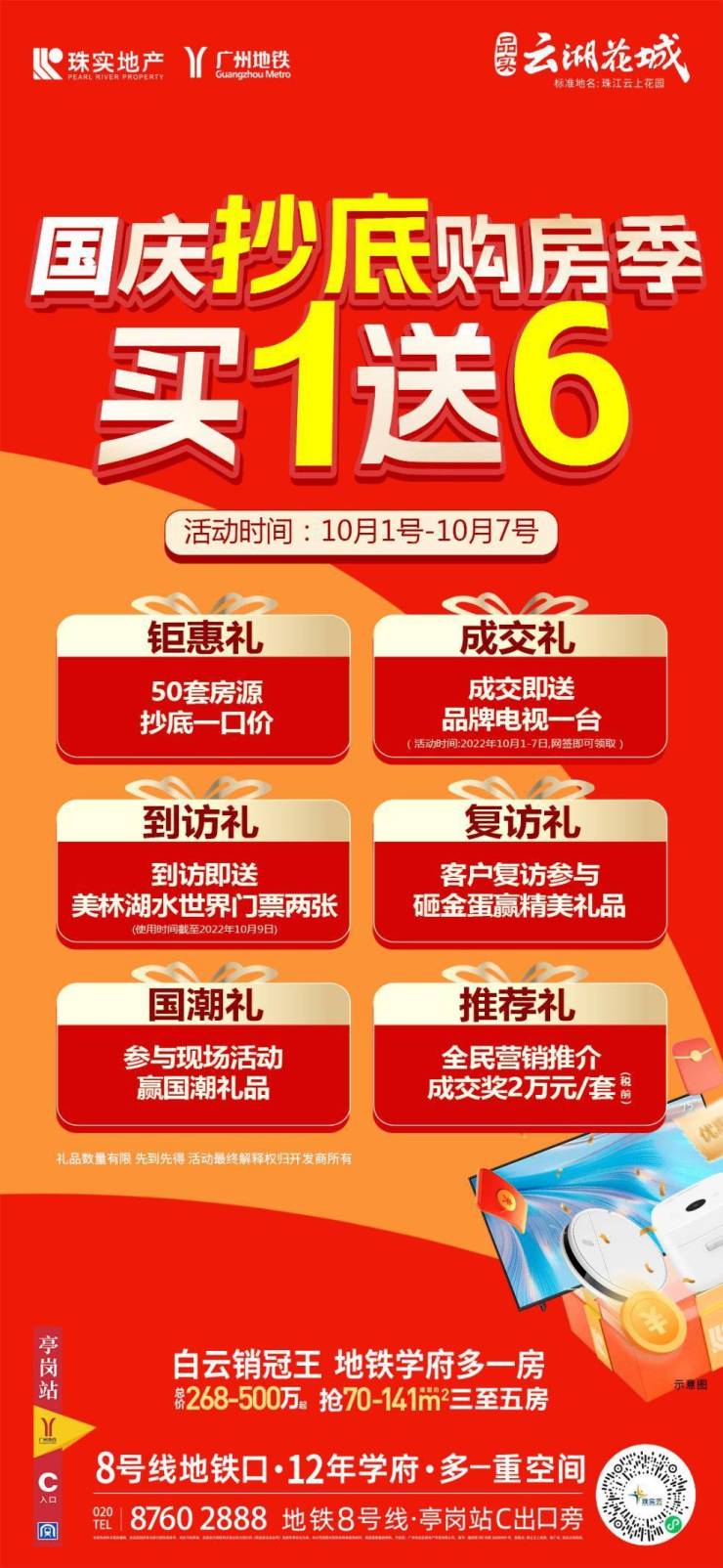 除了全新70㎡样板房开放外,十一黄金周云湖花城推出“抄底购房季,买1送6,有50套抄底一口价房源、成交赠送华为电视一台(网签即可领取)、云湖花城老带新成交,新旧业主各赠送2年物管费、到访即送美林湖水上世界门票等等,诚意满满。