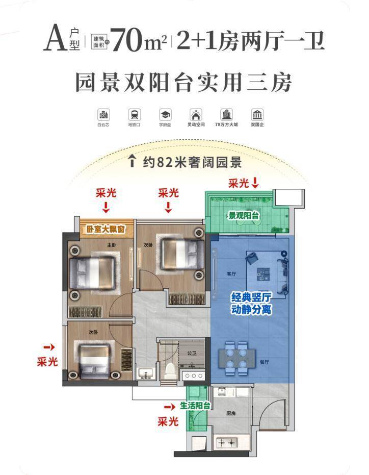 云湖花城的产品自面世以来就一直受市场追捧,其中70㎡的三房户型更是开盘即售罄的节奏!70㎡三房,做到罕见的双阳台设计、阳台正望园林景观,享受约82米的超宽楼距,视野超级开阔,这种景观资源在一般项目中都会在大户型单位上体现,而云湖花城则是连最小的户型都能兼顾最优质的景观资源;除此之外,面积小总价低,外加实用性还十分高,像市面上70㎡普遍只能做两房,而云湖花城却做到了三房,相当于同等面积多得一间房!这也就是为什么云湖花城70㎡这个产品是云湖花城的爆款产品!每次都做到开盘即售罄!成为全广州人上车盘优选!