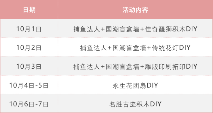 10月1日-7日将有国潮DIY,传统”萌兽“、传统花灯、花艺团扇等,各式各样的现场活动等您来。