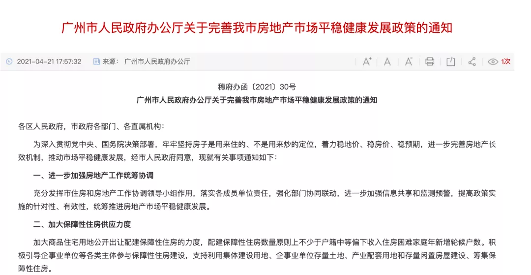 广州市人民政府办公厅关于完善我市房地产市场平稳健康发展政策的通知各区人民政府,市政府各部门、各直属机构:为深入贯彻党中央、国务院决策部署,牢牢坚持房子是用来住的、不是用来炒的定位,着力稳地价、稳房价、稳预期,进一步完善房地产长效机制,推动市场平稳健康发展,经市人民政府同意,现就有关事项通知如下: