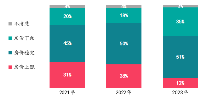 不过,购房者对2023年房价下跌预期仍较强烈。据调查显示,购房者预期2023年房价下跌占比约为35%,较2022年提升17个百分点,预期房价上涨占比仅为12%,同比减少16个百分点;整体来看,2023年房价下跌预期仍较强烈,主要是经济环境持续低迷、收入受到明显影响,导致置业意愿、购房能力出现下滑,短期房价信心仍相对较弱,修复仍需时间。