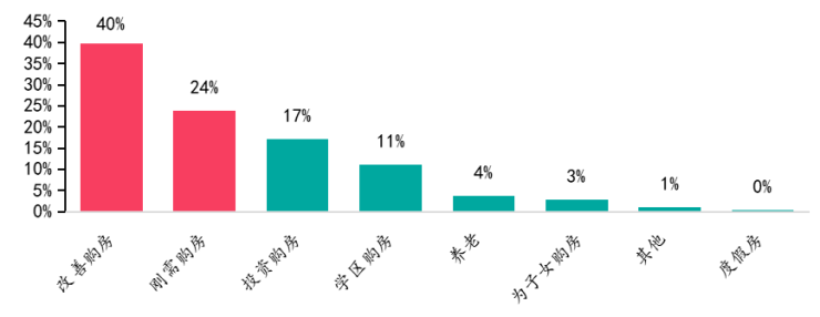 同时,伴随城镇化增速下滑、人口流动节奏放缓、居住需求逐步满足,居民住房需求逐步开始向改善方向发展,据调查显示,2023年改善购房需求占比达到40%,位居各类需求首位,而刚需占比仅为24%,呈现下滑趋势,投资购房、学区购房较2022年均呈现一定程度下滑,养老、度假购房需求较弱。