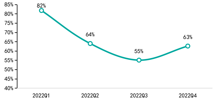 据中指研究院调查显示,2022年前三季度受访者购房需求呈现逐步下滑趋势,2022年第三季度购房需求降至谷底,占比约为55%,较二季度下降9个百分点,较一季度下降27个百分点;而四季度购房需求呈现底部回升,占比约为63%,环比提升8个百分点,主要是受疫情放松、中央及地方重磅救市政策提振带动,但与历史数据相比,整体购房需求仍处于相对低位水平。