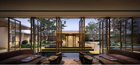 穿过归家会客厅,一副复刻广邸特色珠江骑楼风景的三叠式中心水院—「珠水画境」便徐徐打开。水景两侧分别镶嵌巴西发光奢石--雪山银狐,与水景交相辉映;中央水院边界嵌入下沉式会客区,三面自然围合,宛如坐在珠江岸边般惬意;风雨连廊连接超级泛会所,现代艺术与岭南园林的交相辉映,移步异景。