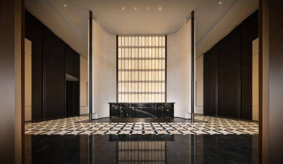 首层约7米高奢酒店式归家会客厅,采用宝格丽酒店御用的维纳多米黄石材墙面,由东方鱼肚白石材与巴西利亚黑奢石打造拼花地面,冰河世纪透光石搭配岭南花窗元素设计背景墙,每一处都是精心雕琢定制;并在空间上融合海派风格和千年东方三进礼序,将五星级酒店的氛围感和仪式感拉满。