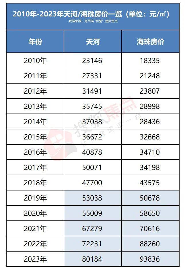 细看数据,天河、海珠两区的房价反转,发生在2019年。