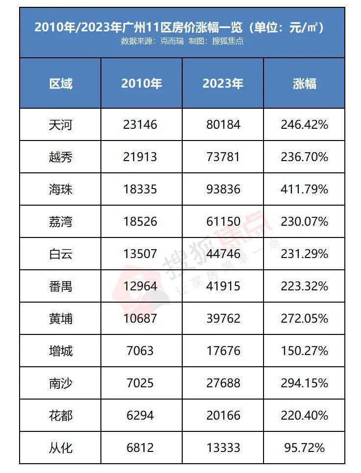 而天河、越秀、荔湾、白云、番禺、黄埔、南沙、花都等区的房价涨幅则均在200%以上。