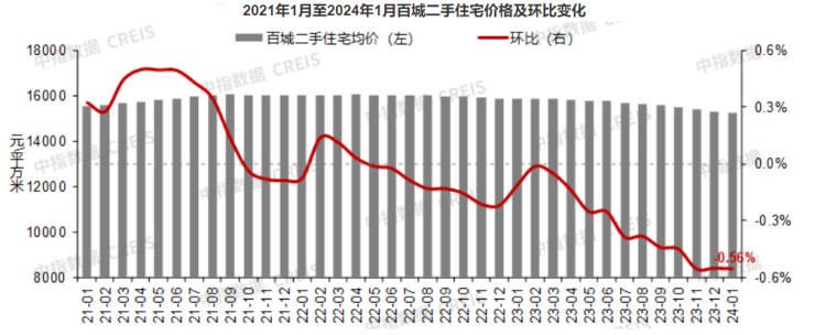 具体来看,1月百城二手住宅平均价格为15230元/平方米,环比下跌0.56%,跌幅较2023年12月扩大0.01个百分点,已连续21个月环比下跌;同比跌幅扩大至3.96%。