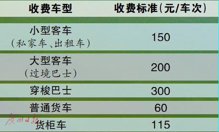 昨晚,港珠澳大桥管理局发布消息,经广东省人民政府批复同意,港珠澳大桥收费站车辆通行费收费标准确定为小型客车(私家车、出租车)150元/车次,大型客车(过境巴士)200元/车次,穿梭巴士300元/车次,普通货车60元/车次,货柜车115元/车次,收费标准以人民币结算。