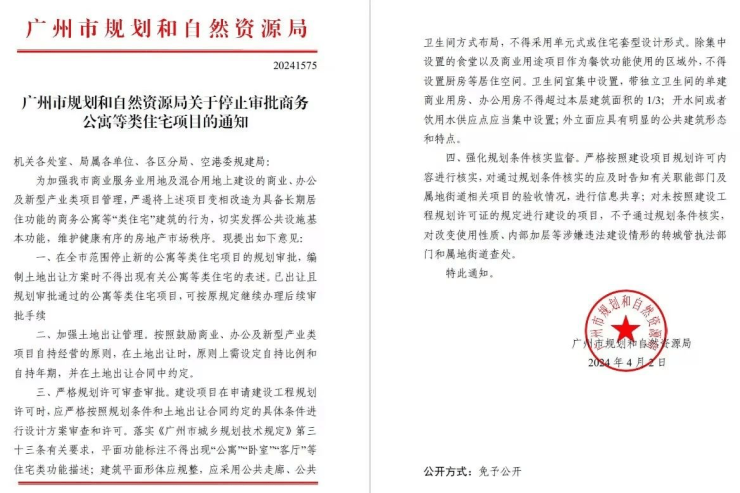 4月9日,网传广州市规划和自然资源局外流一份发布于4月2日的内部文件——《关于停止审批商务公寓等类住宅项目的通知》(下称“通知”)。