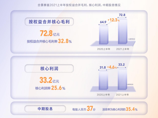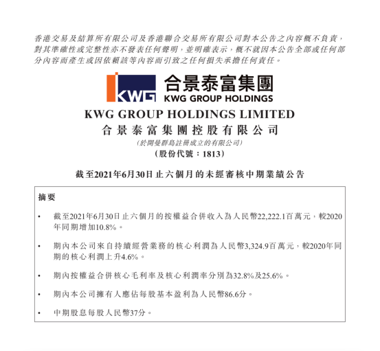 2021年,是合景泰富(HK.1813)成功迈入千亿房企后的排名前列年。千亿目标的完成,促使合景泰富跃入增长的“黄金轨道”。2021年上半年合约销售额达到562亿元,同比增长53%;按权益合并收入222.2亿元,较去年同期增长10.8%;来自持续经营业务的核心利润为33.2亿元,同比增长4.6%;按权益合并核心毛利润为72.8亿元,同比增长12.3%。