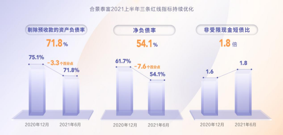 随着财务指标改善与财务结构优化,合景泰富已于2020年末,达成“三道红线”的两项指标。2021年中期,合景泰富的净负债率54.1%,较2020年下降7.6%,剔除预收账款的资产负债率较2020年下降3.3个百分点,非受限现金短债比从1.6倍提升至1.8倍。净负债率和现金短债比处于安全范围,公司有信心在2021年底全部达到绿档。