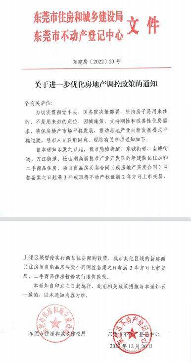 12月26日,东莞市住房和城乡建设局官网发布《关于进一步优化房地产调控政策的通知》(下称“通知”)称,东莞莞城街道、东城街道、南城街道、万江街道、松山湖高新技术产业开发区的新建商品住房和二手商品住房,须自商品房买卖合同(或房地产买卖合同)网签备案之日起满3年或取得不动产权证满2年方可上市交易,上述区域暂停实行商品住房限购政策。这也意味着,即日起东莞全域放开住房限购。