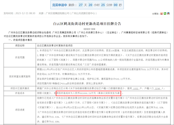 公告显示,除了68.2亿元的改造成本外,黄边村旧改项目的竞得人还需承担38.62万平方米复建住宅地下室和8.32万平方米复建集体物业地下室的建造成本、复建住宅装修成本、教育捐赠费等。