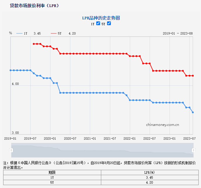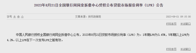 今日(8月21日),人民银行授权全国银行间同业拆借中心公布了新一期贷款市场报价利率(LPR)。其中,1年期LPR为3.45%,上月为3.55%;5年期以上LPR为4.2%,上月为4.2%。