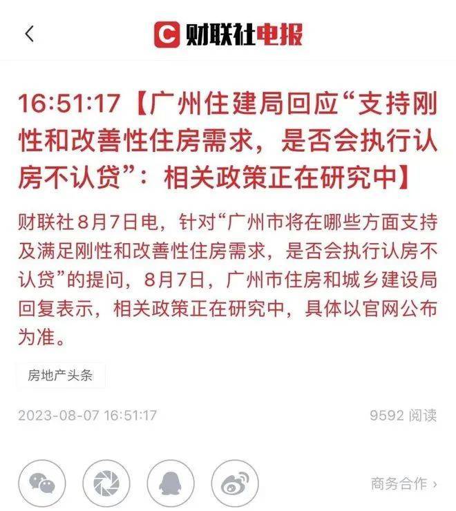 就广州楼市而言,官方近期的一次表态还是在8月7日。针对“广州市将在哪些方面支持及满足刚性和改善性住房需求,是否会执行认房不认贷”的提问,广州住建局表示,相关政策正在研究中,具体以官网公布为准。