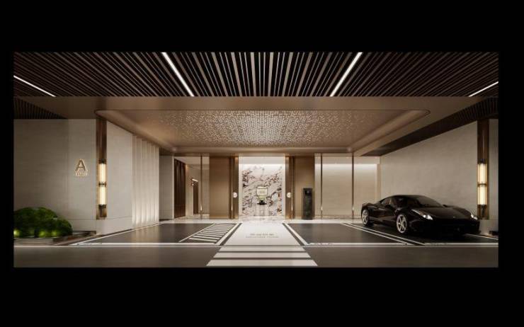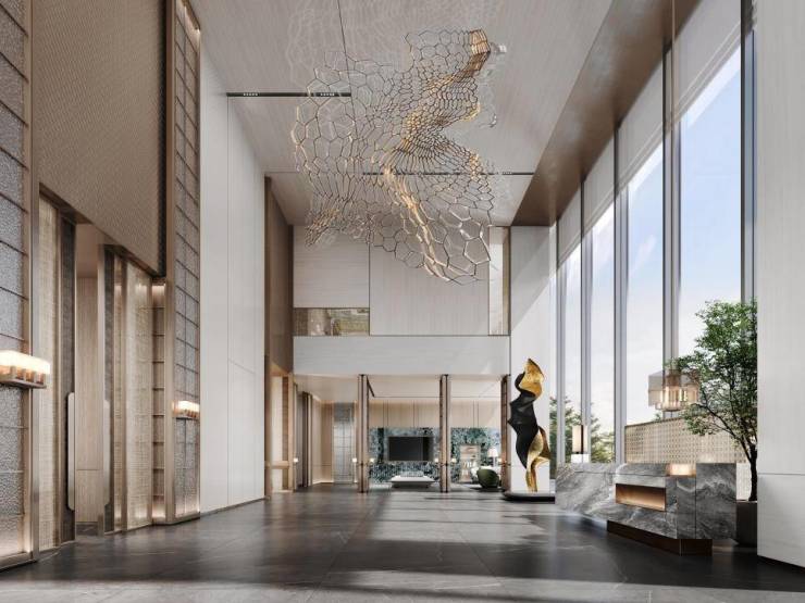 除了外立面,金融家需要的仪式感,西派·L77也在极力满足。公区打造上,高挑入户大堂媲美五星酒店配置,一处专属的落客区,给予业主、访客置身高级会客厅的体验。一层大堂挑高约10米,净高约8米,风格参考五星瑰丽酒店,采用木饰面、艺术玻璃等高品质极具质感的精装用材与威尼斯棕色大理石、奢侈品同款绿色系石材,利用金属,木材,石材自身颜色做出相应的视觉变化,打造如瑰丽酒店般的精致奢华而不失内涵的气派。