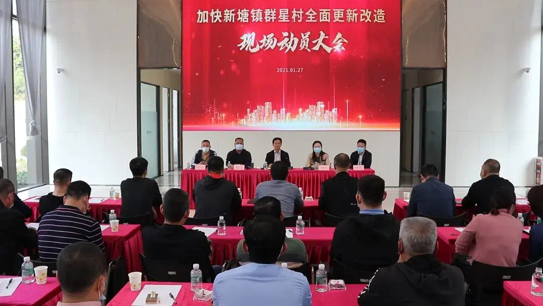 之后,广州市增城区新塘镇领导--群星村两个委员会和社长,与广州升龙集团共同举办现场动员会议,部署加快群星村旧房改造。