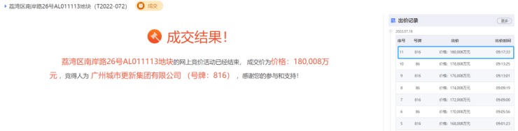 早在2022年7月,珠江实业经过11轮竞价后,拿下荔湾区南岸路地块,当时成交总价达180008万元,折合楼面价为33750元/㎡,溢价12.5%。