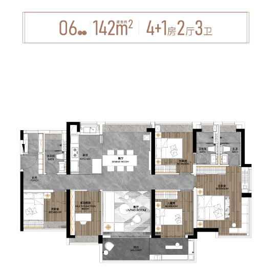 另建面约142㎡4+1房,即便是三代同堂,也不显拥挤。客厅、餐厅、厨房采用LDK一体化设计,带双主套,约6.8米的南向景观阳台,同样为生活增添了一份悠然自得的乐趣。