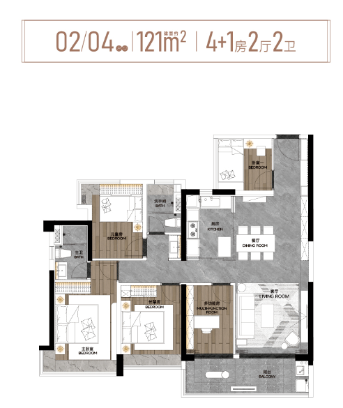 而建面约121m²4+1房,四开间朝南,通风采光性好。约5.7米的超长南向阳台,更是可以直接按需设计出吧台、儿童玩耍区等,满足家庭不同阶段的生活需求。