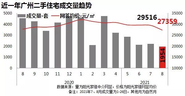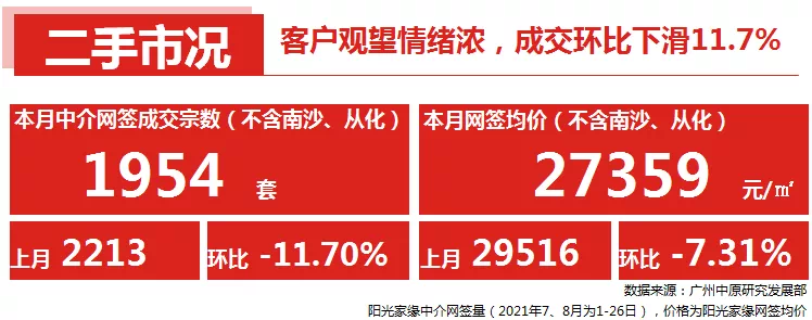 2021年8月(1-26日),广州市二手中介网签量为1954宗(不含自助网签),较7月同期(2213宗)环比回落11.7%。整体看,目前二手市场延续7月的“不温不火”表现,周度中介网签基本维持在500宗左右的低位水平。
