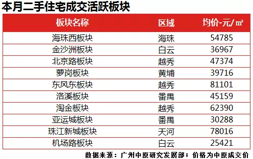 本月越秀区多个板块成交活跃,其活跃板块包括主要以北京路板块、东风东板块、淘金板块为主,本月成交均价分别为47374元/平、81101元/平、62390元/平。此外,番禺区洛溪板块、亚运城板块需求同样活跃,本月成交均价分别为45159元/平、30288元/平。
