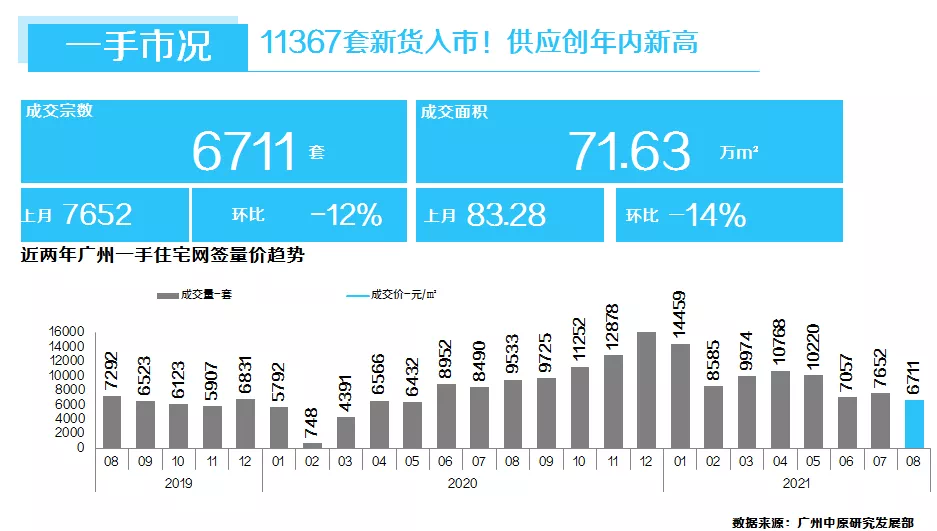 8月新批供应创年内新高,达11367套,创2021年以来新高。除传统开发商备战“金九银十”这一客观原因外,由于4月新政后广州实行更严格的指导价制度(不得高于最近一批预售房屋备案均价下浮3%),为避免多次申请造成指导价过多下浮,部分开发商一次性推出更多货量。如黄埔星汇城、增城港龙皇朝•龙湾壹号均一次性批发过千套单位;此外增城奥园中新誉府、恒大紫荆学府、品秀星图,白云保利锦绣公馆等均批发500套左右新货。8月广州新房网签6711宗,环比下跌12%,“接替”今年6月,成为2021年成交新低。