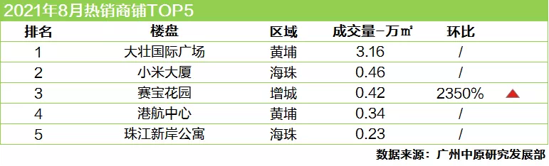 本月商铺市场超6成成交来自黄埔区,主力为大壮国际广场,项目批量网签3.16万㎡的商铺。