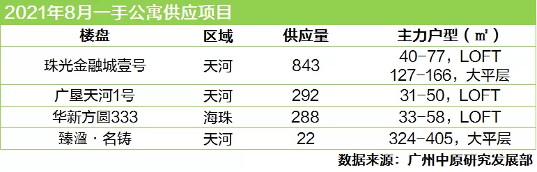 本月公寓市场供应来自在天河、海珠两区。其中,金融城珠光金融城壹号集中批售四栋公寓,包含712套LOFT公寓和131套商业大平层。同板块的臻溋·名铸也有22套商业大平层新货入市。另外,天河梅花园板块的广垦天河1号、海珠广纸板块的华新方圆333两个新盘亮相,分别供应292套、288套LOFT公寓。