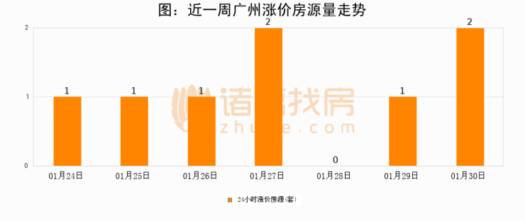 根据诸葛找房数据显示,广州24小时涨价房源量为2套,较01月29日增加1套,环比上涨100%。与此同时,涨价房源占比小幅扩大,业主信心有所提升。