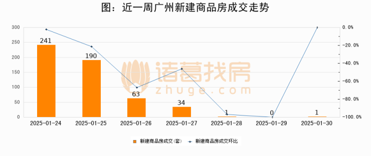 根据广州市住房和城乡建设局数据显示,2025年01月30日广州新建商品房成交1套,较昨日增加1套,环比上涨0%