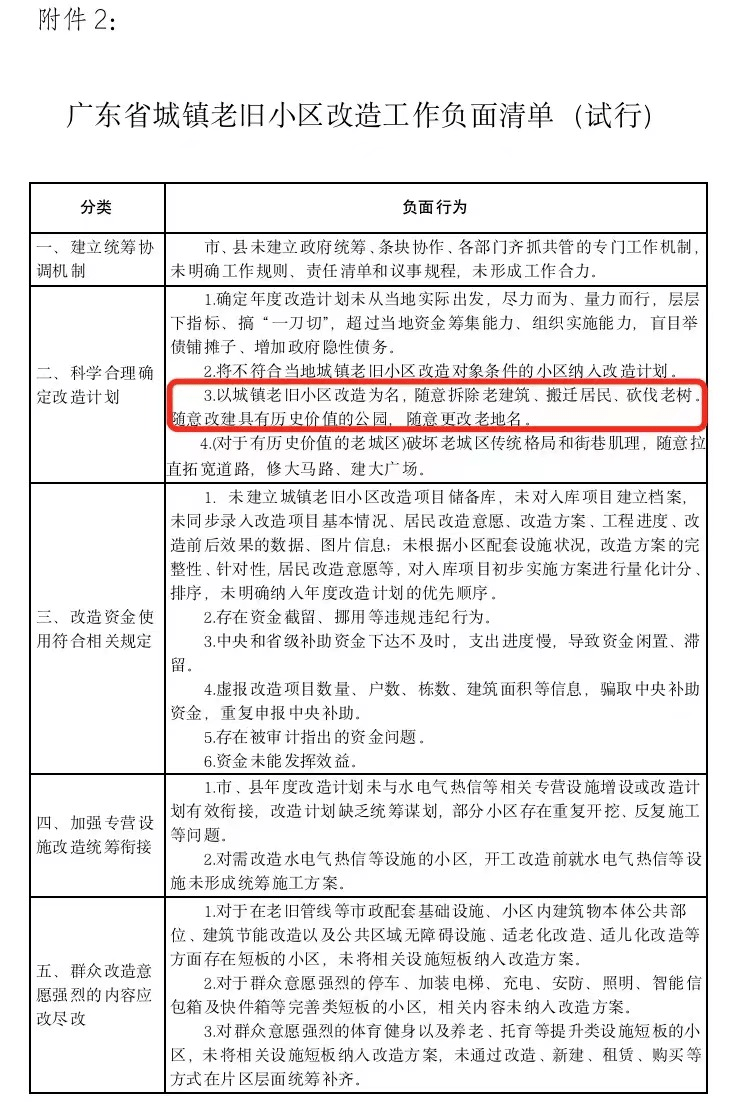 此外,随意拆除老建筑、搬迁居民、砍伐老树等行为,也都被列入负面清单。