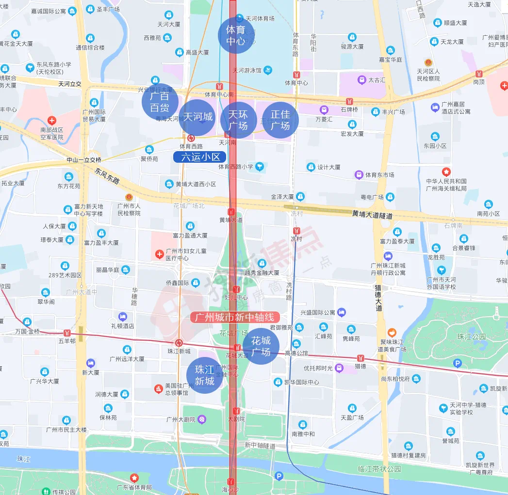 摊开地图,我们不难发现六运小区正位于广州新城市中轴线上,天河南二路和体育东横街之间,北接天河北CBD,南临珠江新城商务区,地理位置优质。