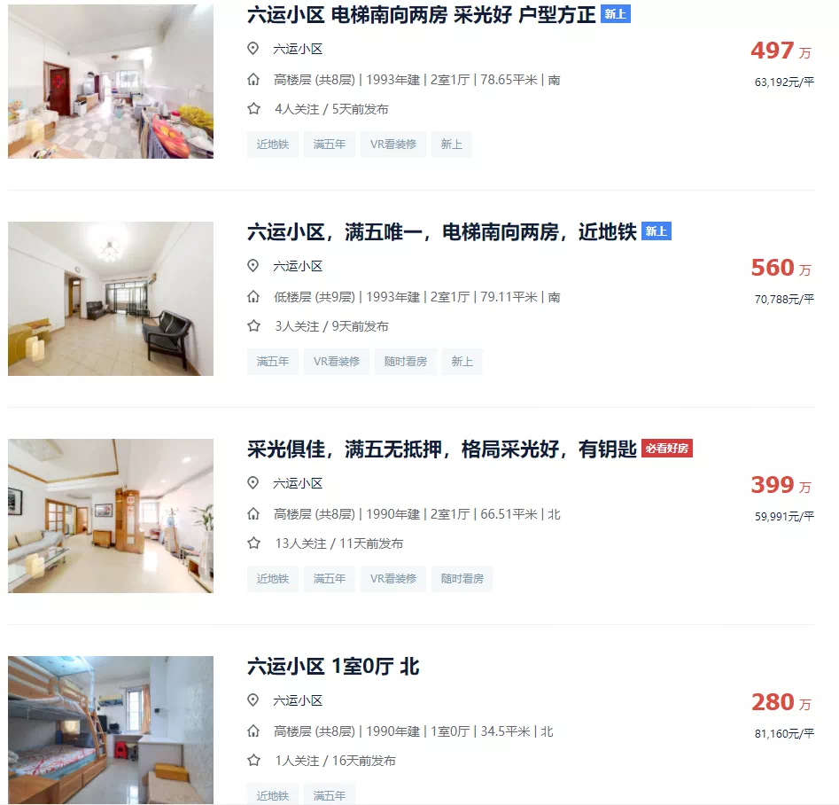 在贝壳二手房平台,六运小区现有在售二手房房源56套,出租房源137套。