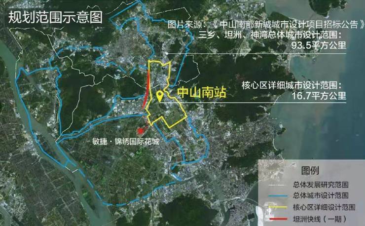 中山市公共资源交易中心发布的关于南部新城的设计招标中,明确“中山南站”位置就在坦洲永二片区(规划中),按照规划示意图看,距离中山·敏捷锦绣国际花城约6公里距离(数据来源:高德地图),珠中生活圈(来源:中山发布)进一步扩大。