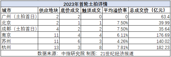 苏州于2月23日举行的2023年首轮土拍中,11宗地块有 5宗溢价成交,3宗触及地价上限,土地成交总价140亿元,平均溢价率7.46%。
