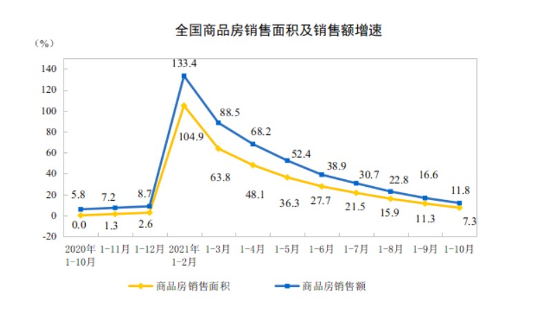商品房销售量价方面,国家统计局数据显示,1—10月份,商品房销售面积143041万平方米,同比增长7.3%;比2019年1—10月份增长7.3%,两年平均增长3.6%。其中,住宅销售面积增长7.1%,办公楼销售面积增长2.4%,商业营业用房销售面积下降0.6%。