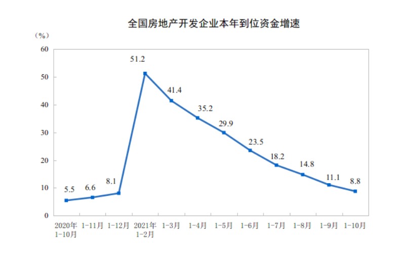 11月15日,国家统计局发布2021年1-10月份全国房地产开发投资和销售情况。数据显示,自今年2月达到小高峰后,全国房地产开发投资增速持续收窄,目前房地产开发投资增速已连续8个月收窄,且该指标连续两个月维持个位数的水平。